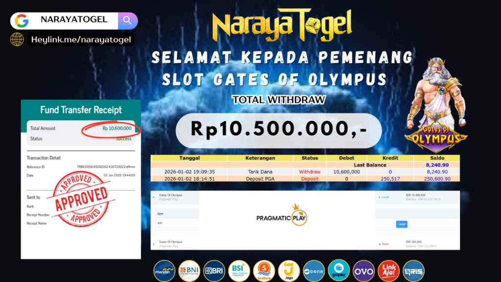 Selamat kepada User id LIO*** Telah berhasil mendapatkan kemenangan besar pada permainan GATES OF OLYMPUS Dengan kemenangan Sebesar Rp10.500.000 Setelah mengisi formulir withdraw dengan kurang waktu hanya 1 – 10 menit pihak NARAYATOGEL sudah melakukan transfer kepada pemiliknya dan dana sudah masuk ke rekening id tersebut oleh pemenang. Bukti pembayaran yang kami berikan merupakan bukti pembayaran yang SAH / VALID yang langsung di dapatkan melalui tanda transfer transaksi berhasil dari Bank yang di tuju.