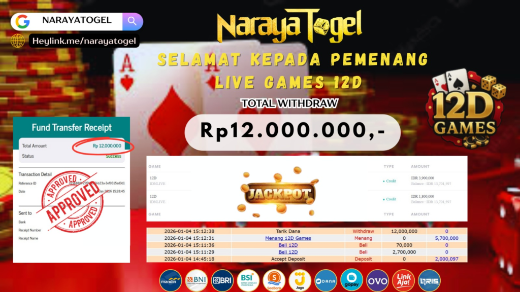 Selamat kepada User id FOP*** Telah berhasil mendapatkan kemenangan besar pada permainan LIVE GAMES 12D Dengan kemenangan Sebesar Rp12.000.000 Setelah mengisi formulir withdraw dengan kurang waktu hanya 1 – 10 menit pihak NARAYATOGEL sudah melakukan transfer kepada pemiliknya dan dana sudah masuk ke rekening id tersebut oleh pemenang. Bukti pembayaran yang kami berikan merupakan bukti pembayaran yang SAH / VALID yang langsung di dapatkan melalui tanda transfer transaksi berhasil dari Bank yang di tuju.