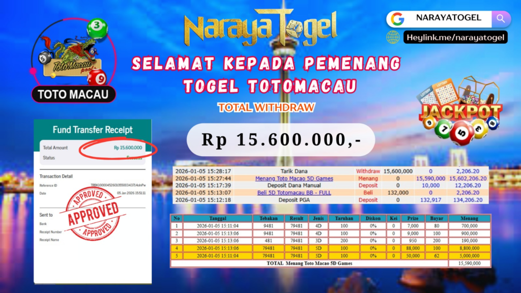 Selamat kepada User id kop*** Telah berhasil mendapatkan kemenangan besar pada permainan TOGEL TOTOMACAU Dengan kemenangan Sebesar Rp15.600.000 Setelah mengisi formulir withdraw dengan kurang waktu hanya 1 – 10 menit pihak NARAYATOGEL sudah melakukan transfer kepada pemiliknya dan dana sudah masuk ke rekening id tersebut oleh pemenang. Bukti pembayaran yang kami berikan merupakan bukti pembayaran yang SAH / VALID yang langsung di dapatkan melalui tanda transfer transaksi berhasil dari Bank yang di tuju.