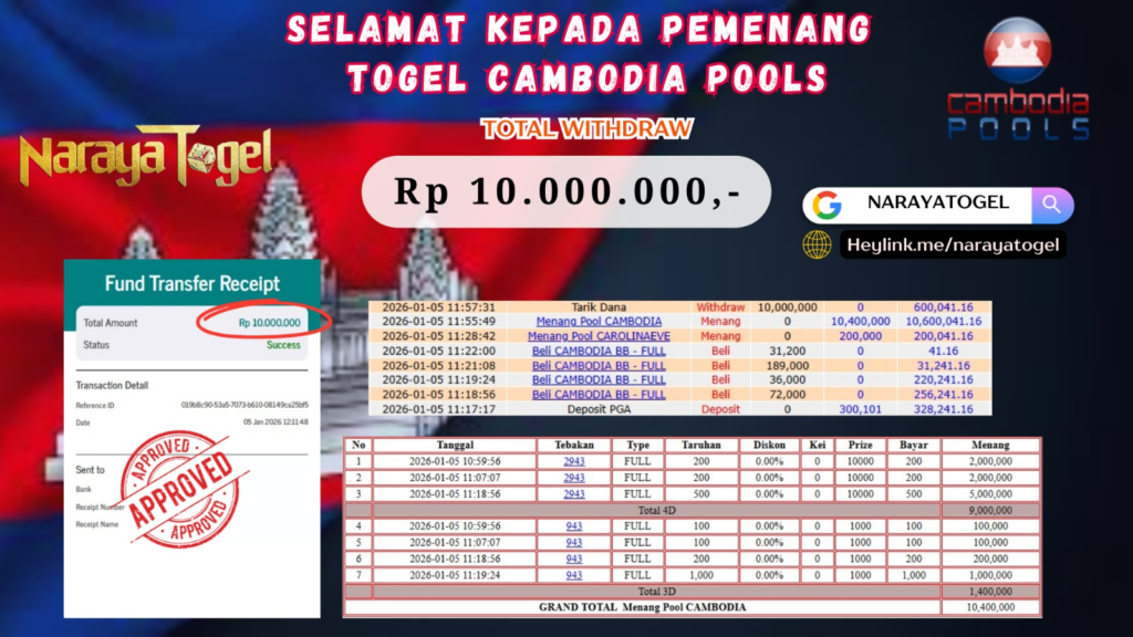 Selamat kepada User id KOP*** Telah berhasil mendapatkan kemenangan besar pada permainan TOGEL CAMBODIA POOLS Dengan kemenangan Sebesar Rp10.000.000 Setelah mengisi formulir withdraw dengan kurang waktu hanya 1 – 10 menit pihak NARAYATOGEL sudah melakukan transfer kepada pemiliknya dan dana sudah masuk ke rekening id tersebut oleh pemenang. Bukti pembayaran yang kami berikan merupakan bukti pembayaran yang SAH / VALID yang langsung di dapatkan melalui tanda transfer transaksi berhasil dari Bank yang di tuju.