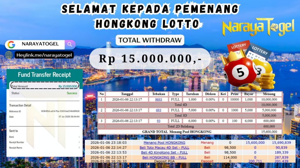 Selamat kepada User id EL*** Telah berhasil mendapatkan kemenangan besar pada permainan HONGKONG LOTTO  Dengan kemenangan Sebesar  Rp15.000.000 Setelah mengisi formulir withdraw dengan kurang waktu hanya 1 – 10 menit pihak NARAYATOGEL sudah melakukan transfer kepada pemiliknya dan dana sudah masuk ke rekening id tersebut oleh pemenang. Bukti pembayaran yang kami berikan merupakan bukti pembayaran yang SAH / VALID yang langsung di dapatkan melalui tanda transfer transaksi berhasil dari Bank yang di tuju.