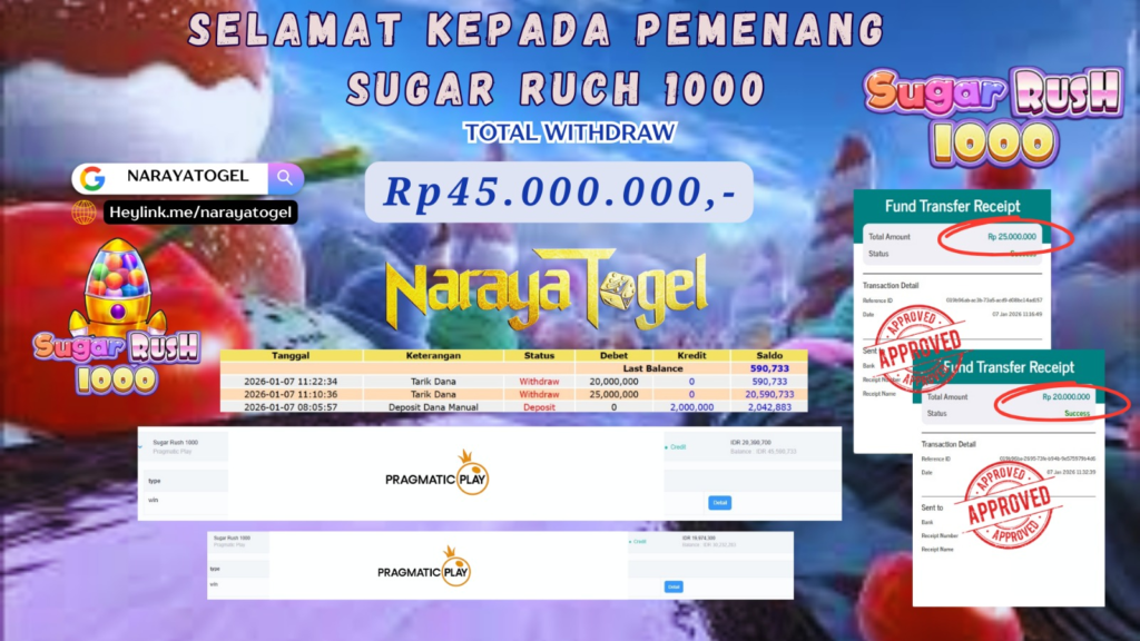Selamat kepada User id HOP** Telah berhasil mendapatkan kemenangan besar pada permainan SLOT SUGAR RUSH 1000 Dengan kemenangan Sebesar Rp 45.000.000 Setelah mengisi formulir withdraw dengan kurang waktu hanya 1 – 10 menit pihak NARAYATOGEL sudah melakukan transfer kepada pemiliknya dan dana sudah masuk ke rekening id tersebut oleh pemenang. Bukti pembayaran yang kami berikan merupakan bukti pembayaran yang SAH / VALID yang langsung di dapatkan melalui tanda transfer transaksi berhasil dari Bank yang di tuju.