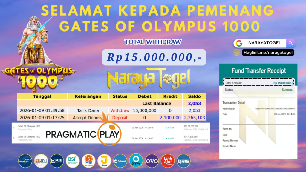 Selamat kepada User id ASYI** Telah berhasil mendapatkan kemenangan besar pada permainan SLOT GATES OF OLYMPUS 1000 Dengan kemenangan Sebesar Rp15.000.000 Setelah mengisi formulir withdraw dengan kurang waktu hanya 1 – 10 menit pihak NARAYATOGEL sudah melakukan transfer kepada pemiliknya dan dana sudah masuk ke rekening id tersebut oleh pemenang. Bukti pembayaran yang kami berikan merupakan bukti pembayaran yang SAH / VALID yang langsung di dapatkan melalui tanda transfer transaksi berhasil dari Bank yang di tuju.