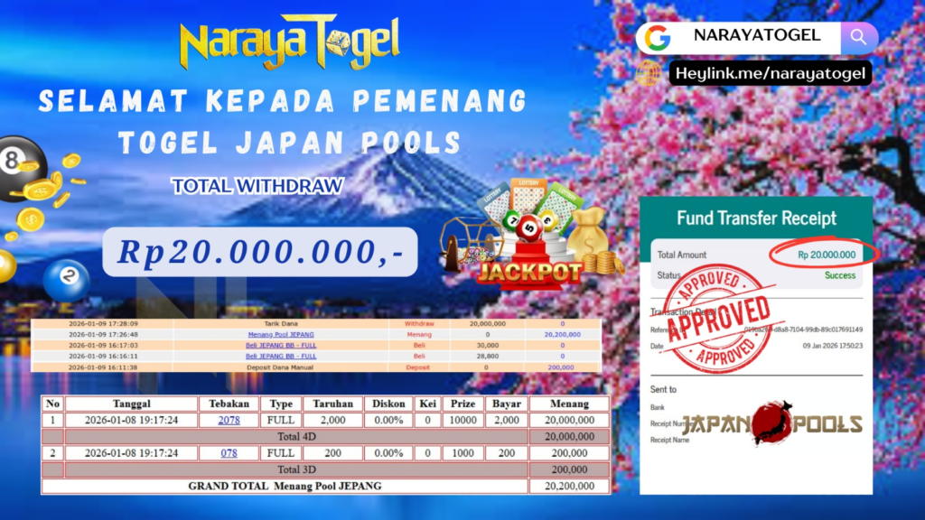 Selamat kepada User id BOP** Telah berhasil mendapatkan kemenangan besar pada permainan TOGEL JAPAN POOLS    Dengan kemenangan Sebesar  Rp20.000.000 Setelah mengisi formulir withdraw dengan kurang waktu hanya 1 – 10 menit pihak NARAYATOGEL sudah melakukan transfer kepada pemiliknya dan dana sudah masuk ke rekening id tersebut oleh pemenang. Bukti pembayaran yang kami berikan merupakan bukti pembayaran yang SAH / VALID yang langsung di dapatkan melalui tanda transfer transaksi berhasil dari Bank yang di tuju.