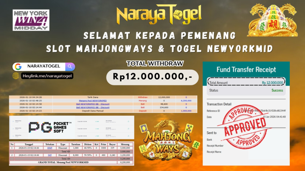 Selamat kepada User id GEMA*** Telah berhasil mendapatkan kemenangan besar pada permainan MAHJONG WAYS & TOGEL KENTUKYMID Dengan kemenangan Sebesar Rp12.000.000 Setelah mengisi formulir withdraw dengan kurang waktu hanya 1 – 10 menit pihak NARAYATOGEL sudah melakukan transfer kepada pemiliknya dan dana sudah masuk ke rekening id tersebut oleh pemenang. Bukti pembayaran yang kami berikan merupakan bukti pembayaran yang SAH / VALID yang langsung di dapatkan melalui tanda transfer transaksi berhasil dari Bank yang di tuju.