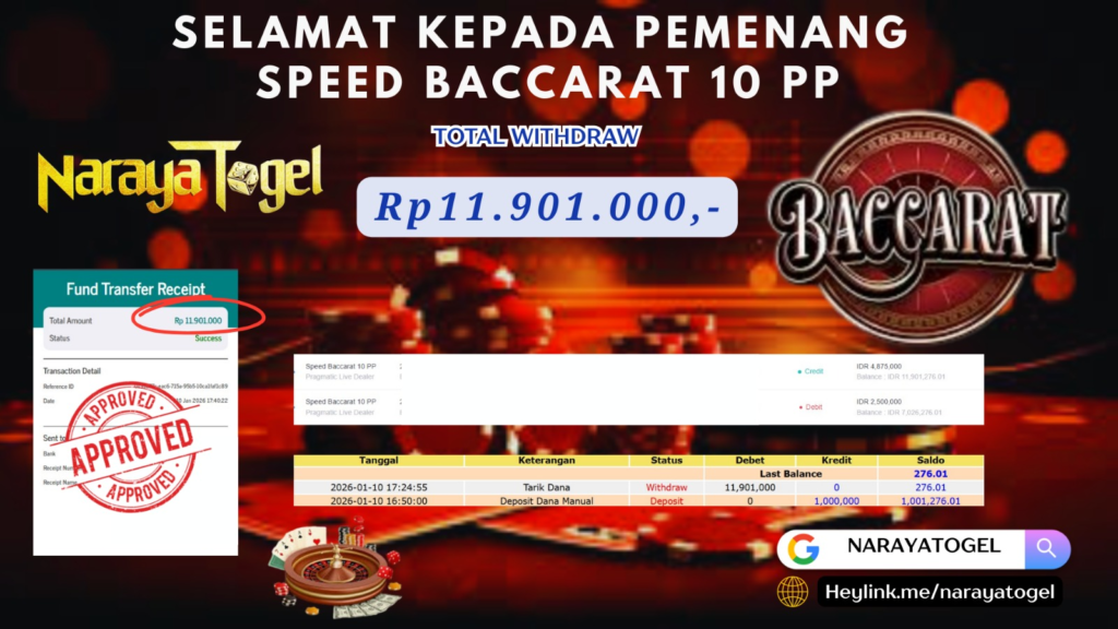Selamat kepada User id GUI*** Telah berhasil mendapatkan kemenangan besar pada permainan SPEED BACCARAT 10 PP    Dengan kemenangan Sebesar  Rp11.901.000 Setelah mengisi formulir withdraw dengan kurang waktu hanya 1 – 10 menit pihak NARAYATOGEL sudah melakukan transfer kepada pemiliknya dan dana sudah masuk ke rekening id tersebut oleh pemenang. Bukti pembayaran yang kami berikan merupakan bukti pembayaran yang SAH / VALID yang langsung di dapatkan melalui tanda transfer transaksi berhasil dari Bank yang di tuju.