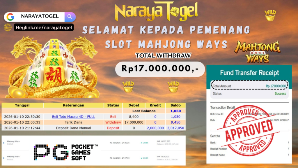 Selamat kepada User id GIFU*** Telah berhasil mendapatkan kemenangan besar pada permainan MAHJONG WAYS    Dengan kemenangan Sebesar  Rp17.000.000 Setelah mengisi formulir withdraw dengan kurang waktu hanya 1 – 10 menit pihak NARAYATOGEL sudah melakukan transfer kepada pemiliknya dan dana sudah masuk ke rekening id tersebut oleh pemenang. Bukti pembayaran yang kami berikan merupakan bukti pembayaran yang SAH / VALID yang langsung di dapatkan melalui tanda transfer transaksi berhasil dari Bank yang di tuju.
