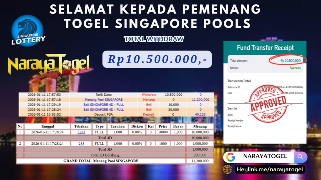 Selamat kepada User id FOP*** Telah berhasil mendapatkan kemenangan besar pada permainan  TOGEL SINGAPORE POOLS    Dengan kemenangan Sebesar  Rp10.500.000 Setelah mengisi formulir withdraw dengan kurang waktu hanya 1 – 10 menit pihak NARAYATOGEL sudah melakukan transfer kepada pemiliknya dan dana sudah masuk ke rekening id tersebut oleh pemenang. Bukti pembayaran yang kami berikan merupakan bukti pembayaran yang SAH / VALID yang langsung di dapatkan melalui tanda transfer transaksi berhasil dari Bank yang di tuju.
