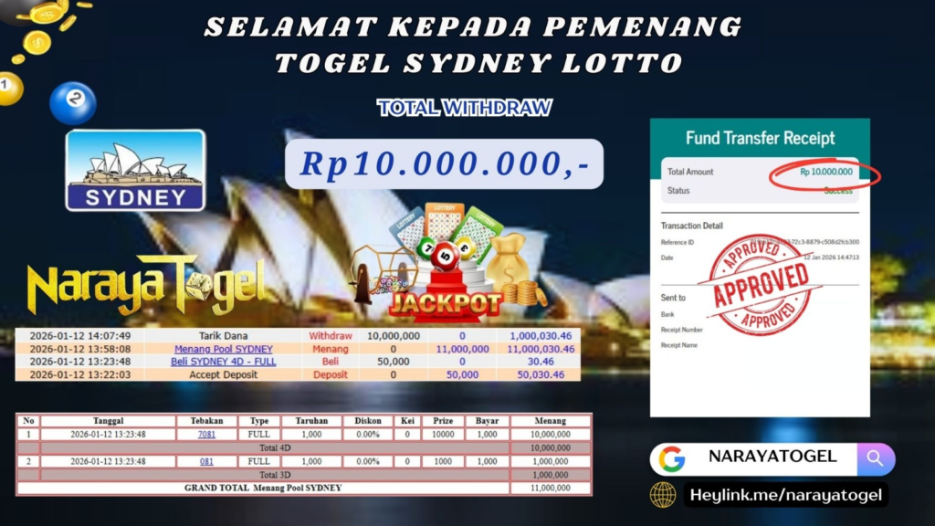 Selamat kepada User id LOPE*** Telah berhasil mendapatkan kemenangan besar pada permainan  TOGEL SYDNEY LOTTO     Dengan kemenangan Sebesar  Rp10.000.000 Setelah mengisi formulir withdraw dengan kurang waktu hanya 1 – 10 menit pihak NARAYATOGEL sudah melakukan transfer kepada pemiliknya dan dana sudah masuk ke rekening id tersebut oleh pemenang. Bukti pembayaran yang kami berikan merupakan bukti pembayaran yang SAH / VALID yang langsung di dapatkan melalui tanda transfer transaksi berhasil dari Bank yang di tuju.