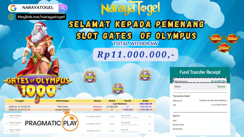 Selamat kepada User id DEIR*** Telah berhasil mendapatkan kemenangan besar pada permainan SLOT GATES OF OLYMPUS Dengan kemenangan Sebesar Rp11.000.000 Setelah mengisi formulir withdraw dengan kurang waktu hanya 1 – 10 menit pihak NARAYATOGEL sudah melakukan transfer kepada pemiliknya dan dana sudah masuk ke rekening id tersebut oleh pemenang. Bukti pembayaran yang kami berikan merupakan bukti pembayaran yang SAH / VALID yang langsung di dapatkan melalui tanda transfer transaksi berhasil dari Bank yang di tuju.