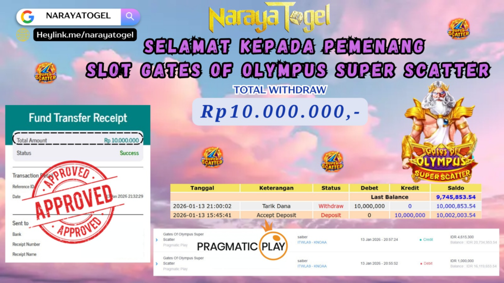 Selamat kepada User id ASTA*** Telah berhasil mendapatkan kemenangan besar pada permainan GATES OF OLYMPUS SUPER SCATETR Dengan kemenangan Sebesar Rp10.000.000 Setelah mengisi formulir withdraw dengan kurang waktu hanya 1 – 10 menit pihak NARAYATOGEL sudah melakukan transfer kepada pemiliknya dan dana sudah masuk ke rekening id tersebut oleh pemenang. Bukti pembayaran yang kami berikan merupakan bukti pembayaran yang SAH / VALID yang langsung di dapatkan melalui tanda transfer transaksi berhasil dari Bank yang di tuju.