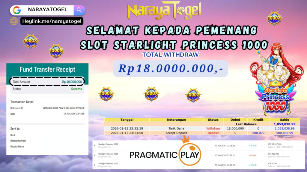 Selamat kepada User id MERRY*** Telah berhasil mendapatkan kemenangan besar pada permainan SLOT STARLIGHT PRINCES 1000 Dengan kemenangan Sebesar Rp18.000.000 Setelah mengisi formulir withdraw dengan kurang waktu hanya 1 – 10 menit pihak NARAYATOGEL sudah melakukan transfer kepada pemiliknya dan dana sudah masuk ke rekening id tersebut oleh pemenang. Bukti pembayaran yang kami berikan merupakan bukti pembayaran yang SAH / VALID yang langsung di dapatkan melalui tanda transfer transaksi berhasil dari Bank yang di tuju.