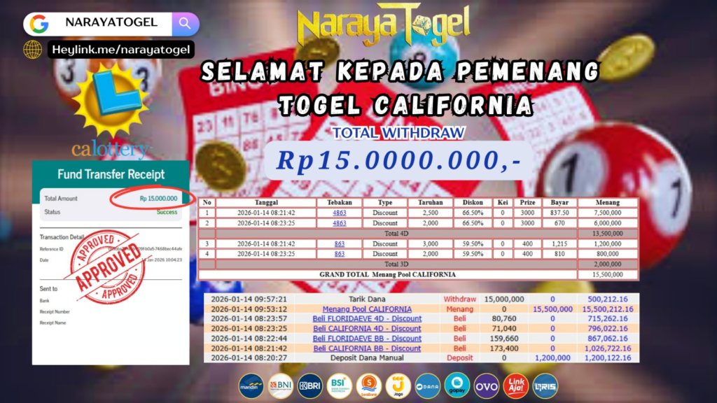 Selamat kepada User id GOP** Telah berhasil mendapatkan kemenangan besar pada permainan TOGEL CALIFORNIA Dengan kemenangan Sebesar Rp15.000.000 Setelah mengisi formulir withdraw dengan kurang waktu hanya 1 – 10 menit pihak NARAYATOGEL sudah melakukan transfer kepada pemiliknya dan dana sudah masuk ke rekening id tersebut oleh pemenang. Bukti pembayaran yang kami berikan merupakan bukti pembayaran yang SAH / VALID yang langsung di dapatkan melalui tanda transfer transaksi berhasil dari Bank yang di tuju.
