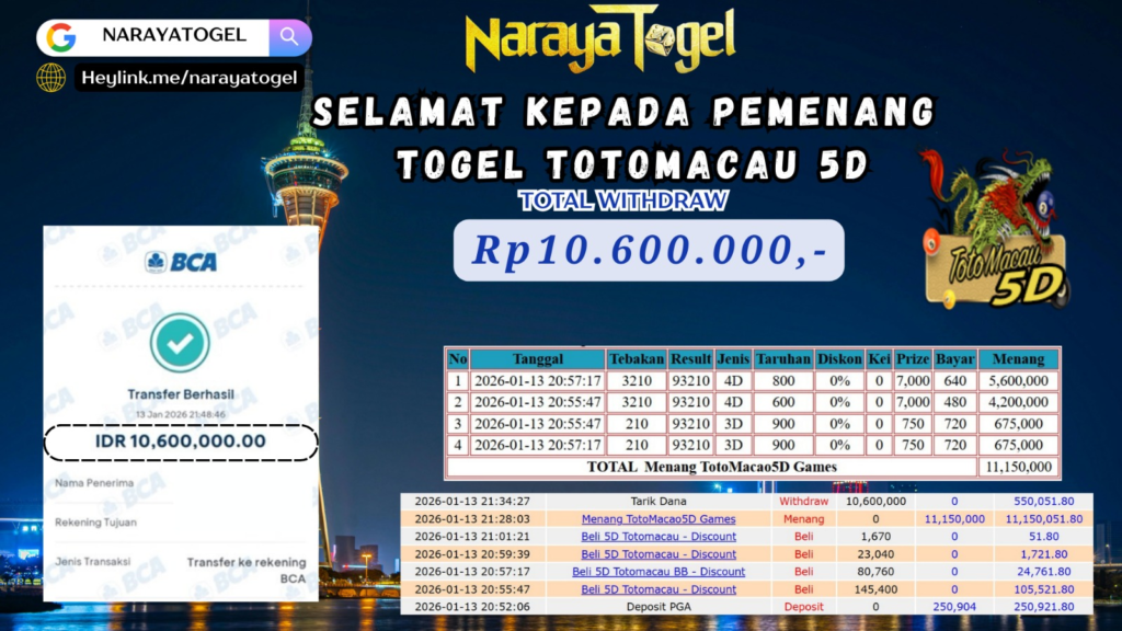 Selamat kepada User id TORO** Telah berhasil mendapatkan kemenangan besar pada permainan TOTOMACAU5D Dengan kemenangan Sebesar  Rp10.600.000  Setelah mengisi formulir withdraw dengan kurang waktu hanya 1 – 10 menit pihak NARAYATOGEL sudah melakukan transfer kepada pemiliknya dan dana sudah masuk ke rekening id tersebut oleh pemenang. Bukti pembayaran yang kami berikan merupakan bukti pembayaran yang SAH / VALID yang langsung di dapatkan melalui tanda transfer transaksi berhasil dari Bank yang di tuju.