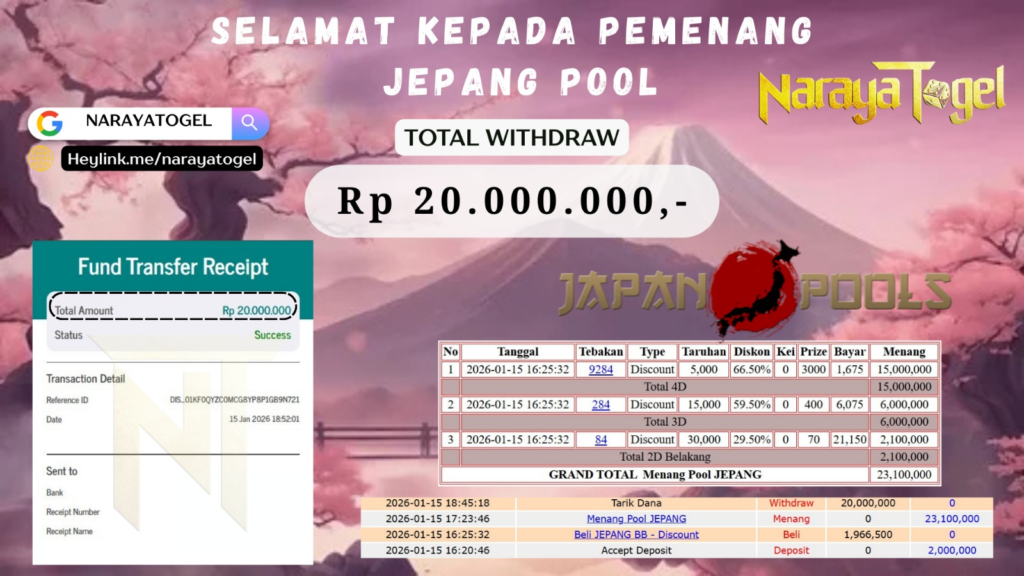 Selamat kepada User id JOHA* Telah berhasil mendapatkan kemenangan besar pada permainan JAPAN POOLS Dengan kemenangan Sebesar  Rp20.000.000  Setelah mengisi formulir withdraw dengan kurang waktu hanya 1 – 10 menit pihak NARAYATOGEL sudah melakukan transfer kepada pemiliknya dan dana sudah masuk ke rekening id tersebut oleh pemenang. Bukti pembayaran yang kami berikan merupakan bukti pembayaran yang SAH / VALID yang langsung di dapatkan melalui tanda transfer transaksi berhasil dari Bank yang di tuju.