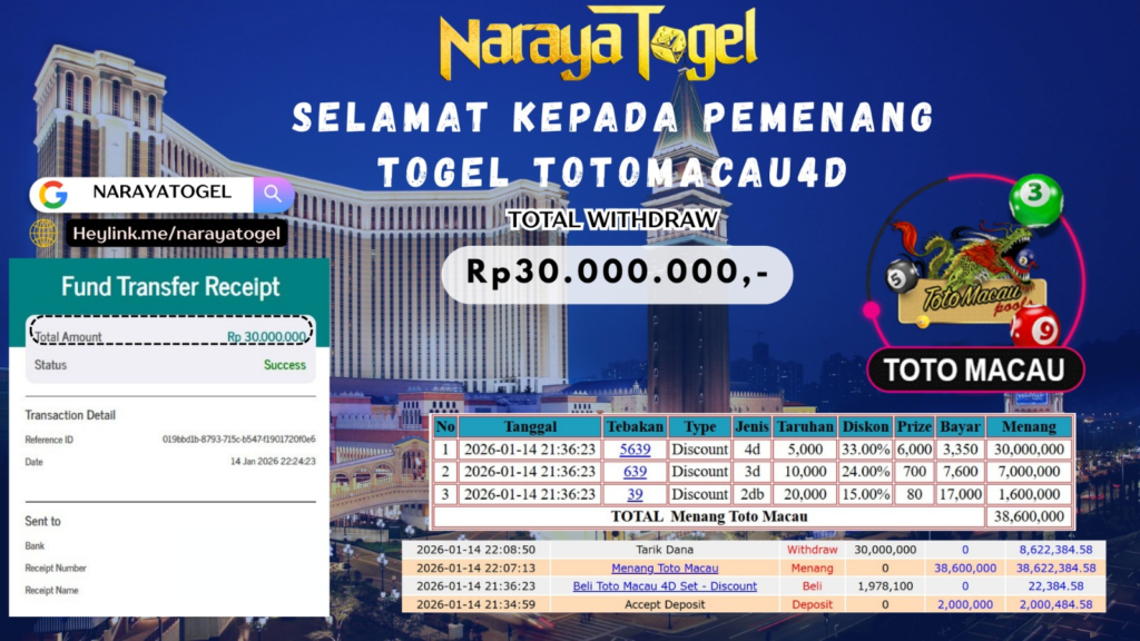Selamat kepada User id BEN** Telah berhasil mendapatkan kemenangan besar pada permainan TOTOMACAU4D Dengan kemenangan Sebesar  Rp30.000.000  Setelah mengisi formulir withdraw dengan kurang waktu hanya 1 – 10 menit pihak NARAYATOGEL sudah melakukan transfer kepada pemiliknya dan dana sudah masuk ke rekening id tersebut oleh pemenang. Bukti pembayaran yang kami berikan merupakan bukti pembayaran yang SAH / VALID yang langsung di dapatkan melalui tanda transfer transaksi berhasil dari Bank yang di tuju.