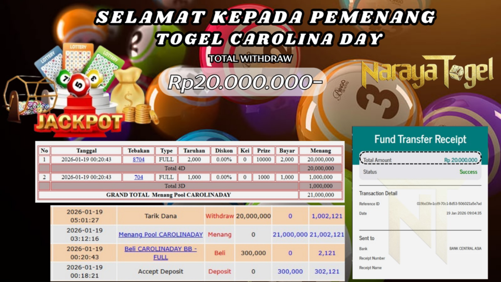 Selamat kepada User id TURN** Telah berhasil mendapatkan kemenangan besar pada permainan TOGEL CAROLINADAY Dengan kemenangan Sebesar Rp20.000.000 Setelah mengisi formulir withdraw dengan kurang waktu hanya 1 – 10 menit pihak NARAYATOGEL sudah melakukan transfer kepada pemiliknya dan dana sudah masuk ke rekening id tersebut oleh pemenang. Bukti pembayaran yang kami berikan merupakan bukti pembayaran yang SAH / VALID yang langsung di dapatkan melalui tanda transfer transaksi berhasil dari Bank yang di tuju.