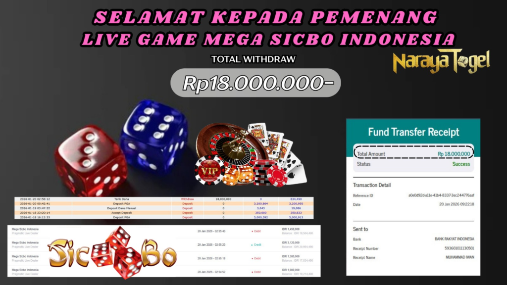 Selamat kepada User id JAY** Telah berhasil mendapatkan kemenangan besar pada permainan LIVE GAME SICBO DICE Dengan kemenangan Sebesar Rp18.000.000 Setelah mengisi formulir withdraw dengan kurang waktu hanya 1 – 10 menit pihak NARAYATOGEL sudah melakukan transfer kepada pemiliknya dan dana sudah masuk ke rekening id tersebut oleh pemenang. Bukti pembayaran yang kami berikan merupakan bukti pembayaran yang SAH / VALID yang langsung di dapatkan melalui tanda transfer transaksi berhasil dari Bank yang di tuju.