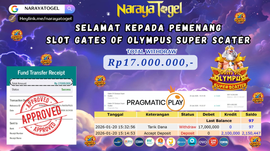 Selamat kepada User id HOND** Telah berhasil mendapatkan kemenangan besar pada permainan SLOT GATES OF OLYMOUS SUOER SCATTER Dengan kemenangan Sebesar Rp17.000.000 Setelah mengisi formulir withdraw dengan kurang waktu hanya 1 – 10 menit pihak NARAYATOGEL sudah melakukan transfer kepada pemiliknya dan dana sudah masuk ke rekening id tersebut oleh pemenang. Bukti pembayaran yang kami berikan merupakan bukti pembayaran yang SAH / VALID yang langsung di dapatkan melalui tanda transfer transaksi berhasil dari Bank yang di tuju.