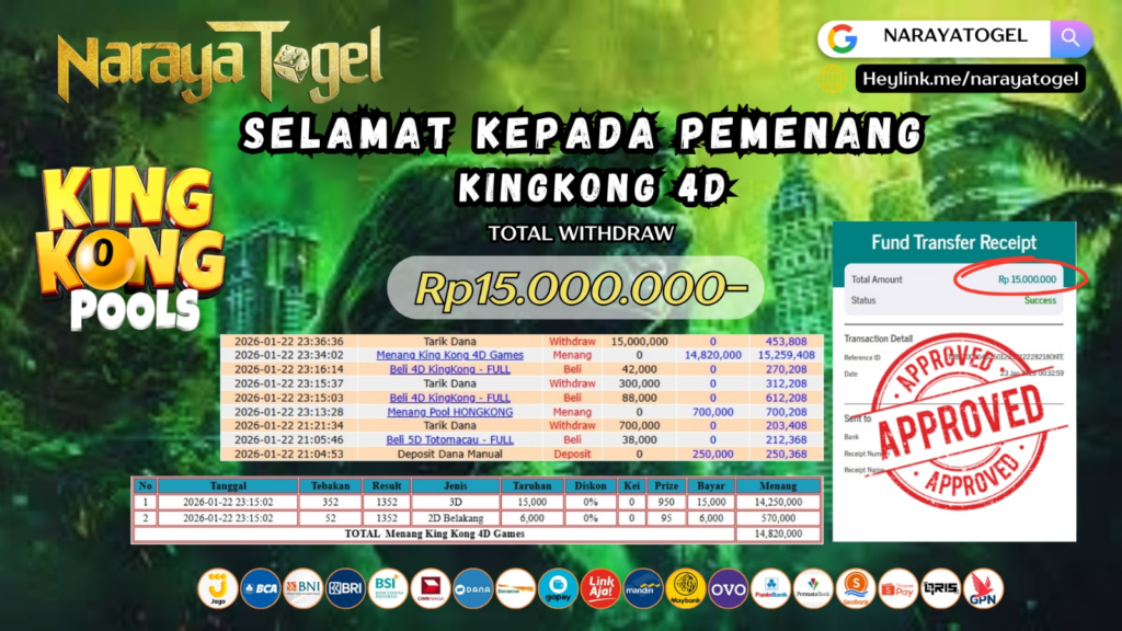 Selamat kepada User id RET** Telah berhasil mendapatkan kemenangan besar pada permainan KINGKONG 4D     Dengan kemenangan Sebesar  Rp15.000.000 Setelah mengisi formulir withdraw dengan kurang waktu hanya 1 – 10 menit pihak NARAYATOGEL sudah melakukan transfer kepada pemiliknya dan dana sudah masuk ke rekening id tersebut oleh pemenang. Bukti pembayaran yang kami berikan merupakan bukti pembayaran yang SAH / VALID yang langsung di dapatkan melalui tanda transfer transaksi berhasil dari Bank yang di tuju.