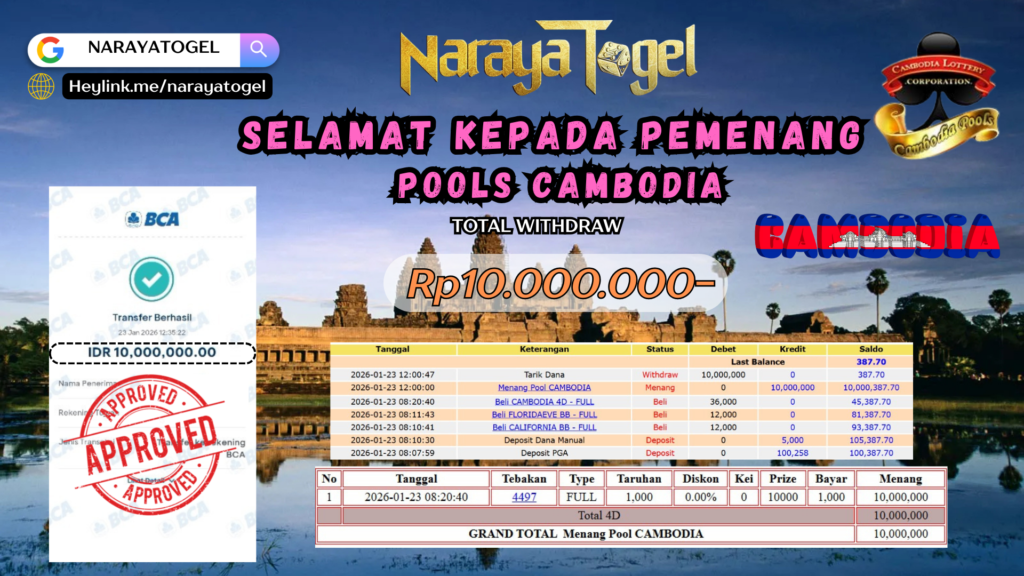 Selamat kepada User id RAYY** Telah berhasil mendapatkan kemenangan besar pada permainan CAMBODIA Dengan kemenangan Sebesar Rp10.000.000 Setelah mengisi formulir withdraw dengan kurang waktu hanya 1 – 10 menit pihak NARAYATOGEL sudah melakukan transfer kepada pemiliknya dan dana sudah masuk ke rekening id tersebut oleh pemenang. Bukti pembayaran yang kami berikan merupakan bukti pembayaran yang SAH / VALID yang langsung di dapatkan melalui tanda transfer transaksi berhasil dari Bank yang di tuju.