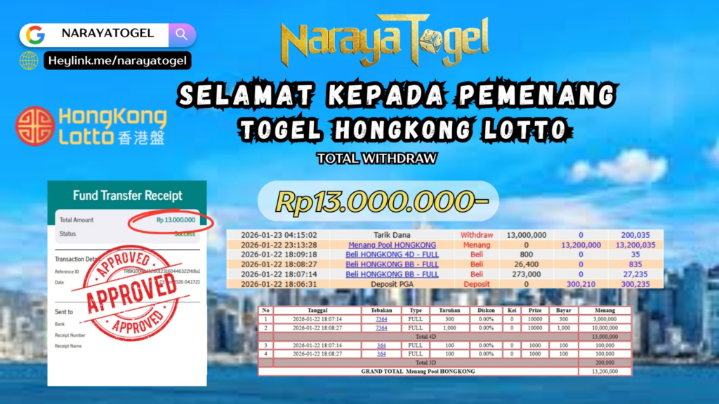 Selamat kepada User id JOP** Telah berhasil mendapatkan kemenangan besar pada permainan TOGEL HONGKONG LOTTO Dengan kemenangan Sebesar Rp13.000.000 Setelah mengisi formulir withdraw dengan kurang waktu hanya 1 – 10 menit pihak NARAYATOGEL sudah melakukan transfer kepada pemiliknya dan dana sudah masuk ke rekening id tersebut oleh pemenang. Bukti pembayaran yang kami berikan merupakan bukti pembayaran yang SAH / VALID yang langsung di dapatkan melalui tanda transfer transaksi berhasil dari Bank yang di tuju.