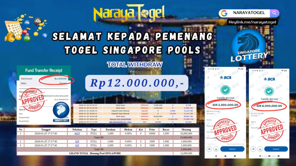 Selamat kepada User id TUI** Telah berhasil mendapatkan kemenangan besar pada permainan TOGEL SINGAPORE POOLS Dengan kemenangan Sebesar  Rp12.000.000 Setelah mengisi formulir withdraw dengan kurang waktu hanya 1 – 10 menit pihak NARAYATOGEL sudah melakukan transfer kepada pemiliknya dan dana sudah masuk ke rekening id tersebut oleh pemenang. Bukti pembayaran yang kami berikan merupakan bukti pembayaran yang SAH / VALID yang langsung di dapatkan melalui tanda transfer transaksi berhasil dari Bank yang di tuju.