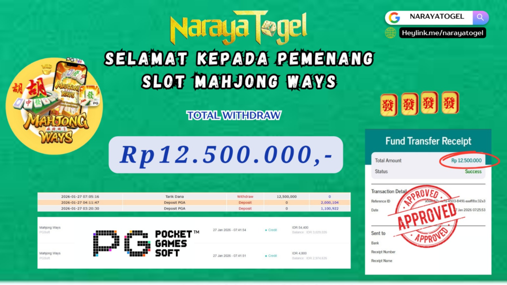 Selamat kepada User id SEWR** Telah berhasil mendapatkan kemenangan besar pada permainan SLOT MAHJONG WAYS Dengan kemenangan Sebesar RP 12.500.000 Setelah mengisi formulir withdraw dengan kurang waktu hanya 1 – 10 menit pihak NARAYATOGEL sudah melakukan transfer kepada pemiliknya dan dana sudah masuk ke rekening id tersebut oleh pemenang. Bukti pembayaran yang kami berikan merupakan bukti pembayaran yang SAH / VALID yang langsung di dapatkan melalui tanda transfer transaksi berhasil dari Bank yang di tuju.