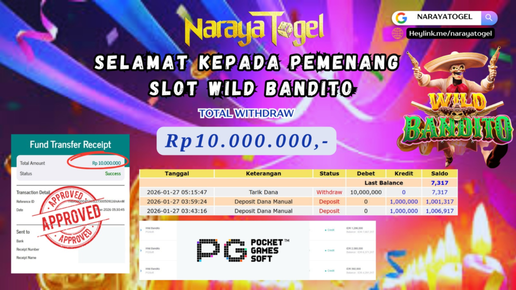 Selamat kepada User id dop** Telah berhasil mendapatkan kemenangan besar pada permainan SLOT WILD BANDITO Dengan kemenangan Sebesar RP 10.000.000 Setelah mengisi formulir withdraw dengan kurang waktu hanya 1 – 10 menit pihak NARAYATOGEL sudah melakukan transfer kepada pemiliknya dan dana sudah masuk ke rekening id tersebut oleh pemenang. Bukti pembayaran yang kami berikan merupakan bukti pembayaran yang SAH / VALID yang langsung di dapatkan melalui tanda transfer transaksi berhasil dari Bank yang di tuju.