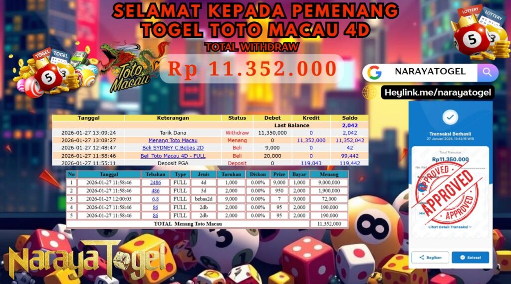Selamat kepada User id LUTF5** Telah berhasil mendapatkan kemenangan besar pada permainan TOGEL TOTO MACAU 4D Dengan kemenangan Sebesar Rp11.352.000 Setelah mengisi formulir withdraw dengan kurang waktu hanya 1 – 10 menit pihak NARAYATOGEL sudah melakukan transfer kepada pemiliknya dan dana sudah masuk ke rekening id tersebut oleh pemenang. Bukti pembayaran yang kami berikan merupakan bukti pembayaran yang SAH / VALID yang langsung di dapatkan melalui tanda transfer transaksi berhasil dari Bank yang di tuju.