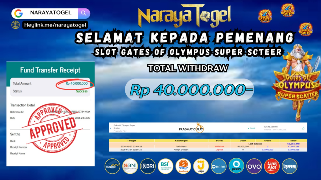 Selamat kepada User id FER** Telah berhasil mendapatkan kemenangan besar pada permainan SLOT GATES OF OLYMPUS SUPER SCTEER Dengan kemenangan Sebesar Rp 40.000.000 Setelah mengisi formulir withdraw dengan kurang waktu hanya 1 – 10 menit pihak NARAYATOGEL sudah melakukan transfer kepada pemiliknya dan dana sudah masuk ke rekening id tersebut oleh pemenang. Bukti pembayaran yang kami berikan merupakan bukti pembayaran yang SAH / VALID yang langsung di dapatkan melalui tanda transfer transaksi berhasil dari Bank yang di tuju.