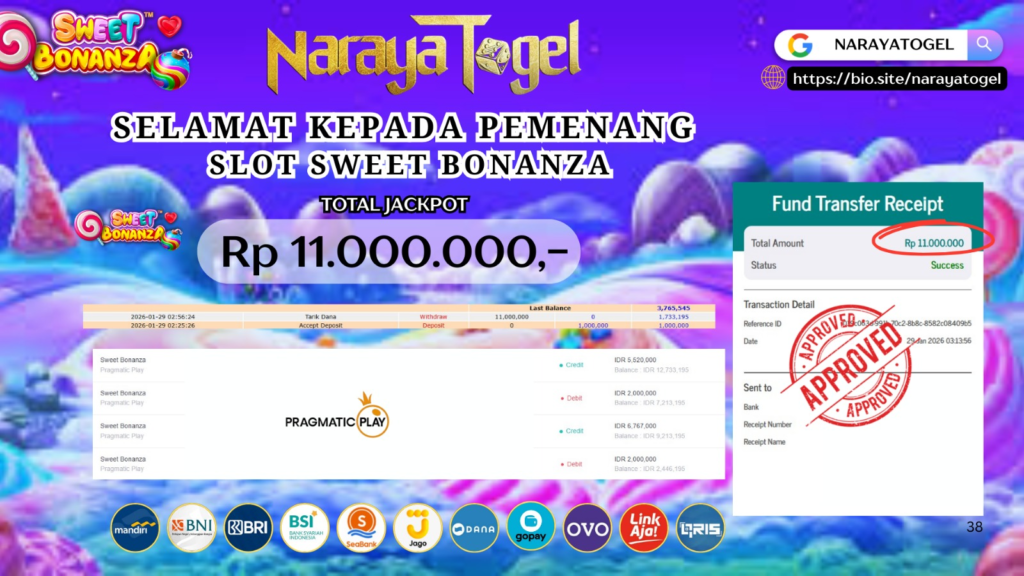 Selamat kepada User id PAHAK** Telah berhasil mendapatkan kemenangan besar pada permainan SLOT SWEET BONANZA     Dengan kemenangan Sebesar  Rp11.000.000 Setelah mengisi formulir withdraw dengan kurang waktu hanya 1 – 10 menit pihak NARAYATOGEL sudah melakukan transfer kepada pemiliknya dan dana sudah masuk ke rekening id tersebut oleh pemenang. Bukti pembayaran yang kami berikan merupakan bukti pembayaran yang SAH / VALID yang langsung di dapatkan melalui tanda transfer transaksi berhasil dari Bank yang di tuju.