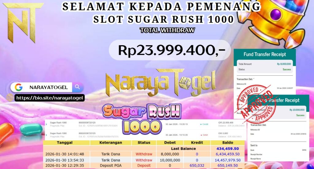 Selamat kepada User id JEIO** Telah berhasil mendapatkan kemenangan besar pada permainan SLOT SUGAR RUSH 1000 Dengan kemenangan Sebesar Rp 23.999.400 Setelah mengisi formulir withdraw dengan kurang waktu hanya 1 – 10 menit pihak NARAYATOGEL sudah melakukan transfer kepada pemiliknya dan dana sudah masuk ke rekening id tersebut oleh pemenang. Bukti pembayaran yang kami berikan merupakan bukti pembayaran yang SAH / VALID yang langsung di dapatkan melalui tanda transfer transaksi berhasil dari Bank yang di tuju.