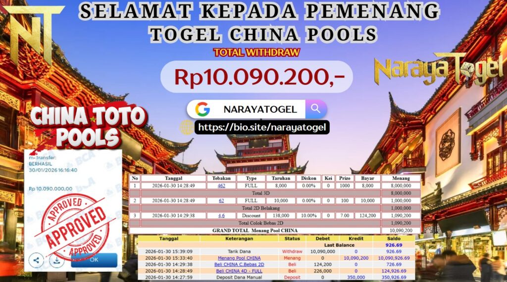 Selamat kepada User id RES** Telah berhasil mendapatkan kemenangan besar pada permainan TOGEL CHINA POOLS Dengan kemenangan Sebesar Rp 10.090.200 Setelah mengisi formulir withdraw dengan kurang waktu hanya 1 – 10 menit pihak NARAYATOGEL sudah melakukan transfer kepada pemiliknya dan dana sudah masuk ke rekening id tersebut oleh pemenang. Bukti pembayaran yang kami berikan merupakan bukti pembayaran yang SAH / VALID yang langsung di dapatkan melalui tanda transfer transaksi berhasil dari Bank yang di tuju.
