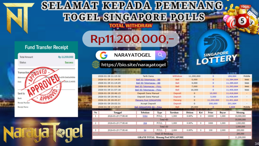Selamat kepada User id HIOP** Telah berhasil mendapatkan kemenangan besar pada permainan TOGEL SINGAPORE POLLS Dengan kemenangan Sebesar Rp11.200.000 Setelah mengisi formulir withdraw dengan kurang waktu hanya 1 – 10 menit pihak NARAYATOGEL sudah melakukan transfer kepada pemiliknya dan dana sudah masuk ke rekening id tersebut oleh pemenang. Bukti pembayaran yang kami berikan merupakan bukti pembayaran yang SAH / VALID yang langsung di dapatkan melalui tanda transfer transaksi berhasil dari Bank yang di tuju.