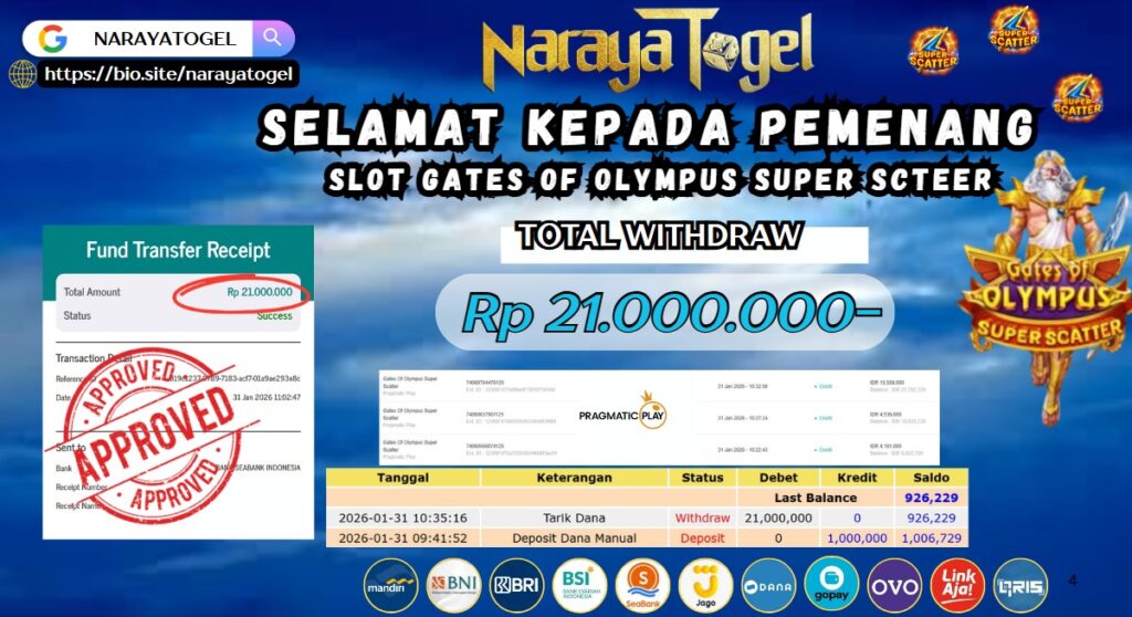 Selamat kepada User id RES** Telah berhasil mendapatkan kemenangan besar pada permainan SLOT GATES OF OLYMPUS SUPER SCATTER Dengan kemenangan Sebesar Rp 21.000.000 Setelah mengisi formulir withdraw dengan kurang waktu hanya 1 – 10 menit pihak NARAYATOGEL sudah melakukan transfer kepada pemiliknya dan dana sudah masuk ke rekening id tersebut oleh pemenang. Bukti pembayaran yang kami berikan merupakan bukti pembayaran yang SAH / VALID yang langsung di dapatkan melalui tanda transfer transaksi berhasil dari Bank yang di tuju.