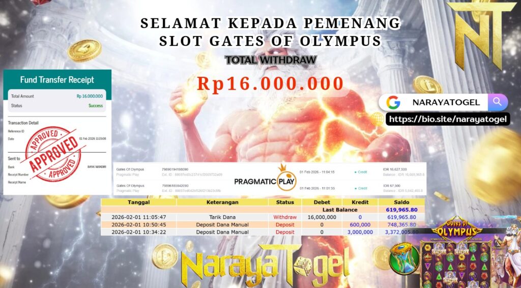 Selamat kepada User id LOS** Telah berhasil mendapatkan kemenangan besar pada permainan SLOT GATES OF OLYMPUS   Dengan kemenangan Sebesar  Rp 16.000.000 Setelah mengisi formulir withdraw dengan kurang waktu hanya 1 – 10 menit pihak NARAYATOGEL sudah melakukan transfer kepada pemiliknya dan dana sudah masuk ke rekening id tersebut oleh pemenang. Bukti pembayaran yang kami berikan merupakan bukti pembayaran yang SAH / VALID yang langsung di dapatkan melalui tanda transfer transaksi berhasil dari Bank yang di tuju.