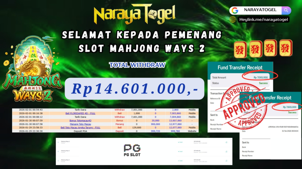 Selamat kepada User id HIU** Telah berhasil mendapatkan kemenangan besar pada permainan SLOT MAHJONG WAYS 2 Dengan kemenangan Sebesar  Rp 14.601.000  Setelah mengisi formulir withdraw dengan kurang waktu hanya 1 – 10 menit pihak NARAYATOGEL sudah melakukan transfer kepada pemiliknya dan dana sudah masuk ke rekening id tersebut oleh pemenang. Bukti pembayaran yang kami berikan merupakan bukti pembayaran yang SAH / VALID yang langsung di dapatkan melalui tanda transfer transaksi berhasil dari Bank yang di tuju.