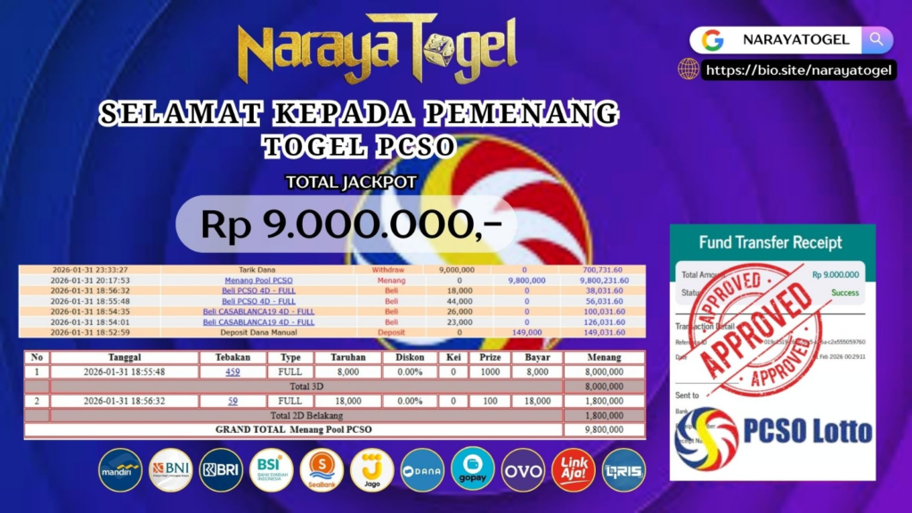 Selamat kepada User id JIOP** Telah berhasil mendapatkan kemenangan besar pada permainan TOGEL PCSO   Dengan kemenangan Sebesar  Rp 9.000.000  Setelah mengisi formulir withdraw dengan kurang waktu hanya 1 – 10 menit pihak NARAYATOGEL sudah melakukan transfer kepada pemiliknya dan dana sudah masuk ke rekening id tersebut oleh pemenang. Bukti pembayaran yang kami berikan merupakan bukti pembayaran yang SAH / VALID yang langsung di dapatkan melalui tanda transfer transaksi berhasil dari Bank yang di tuju.