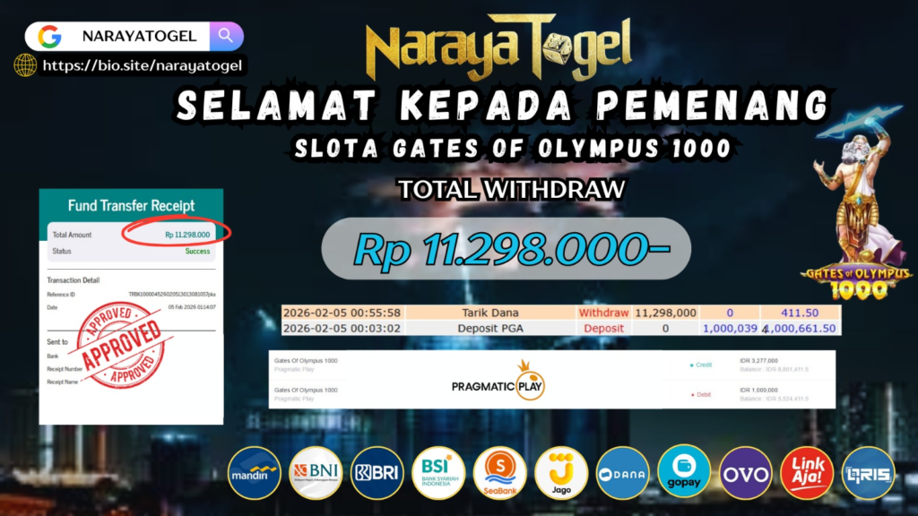 Selamat kepada User id SORR** Telah berhasil mendapatkan kemenangan besar pada permainan GATES OF OLYMPUS SUPERSCATER Dengan kemenangan Sebesar Rp 11.298.000 Setelah mengisi formulir withdraw dengan kurang waktu hanya 1 – 10 menit pihak NARAYATOGEL sudah melakukan transfer kepada pemiliknya dan dana sudah masuk ke rekening id tersebut oleh pemenang. Bukti pembayaran yang kami berikan merupakan bukti pembayaran yang SAH / VALID yang langsung di dapatkan melalui tanda transfer transaksi berhasil dari Bank yang di tuju.