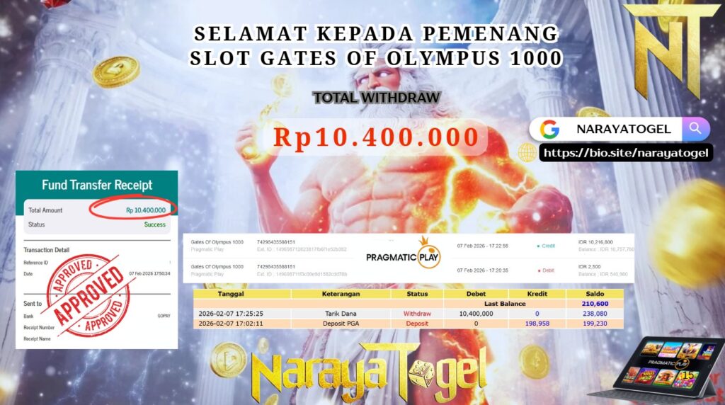 Selamat kepada User id RES** Telah berhasil mendapatkan kemenangan besar pada permainan GATES OF OLYMPUS 1000 Dengan kemenangan Sebesar Rp 10.400.000 Setelah mengisi formulir withdraw dengan kurang waktu hanya 1 – 10 menit pihak NARAYATOGEL sudah melakukan transfer kepada pemiliknya dan dana sudah masuk ke rekening id tersebut oleh pemenang. Bukti pembayaran yang kami berikan merupakan bukti pembayaran yang SAH / VALID yang langsung di dapatkan melalui tanda transfer transaksi berhasil dari Bank yang di tuju.