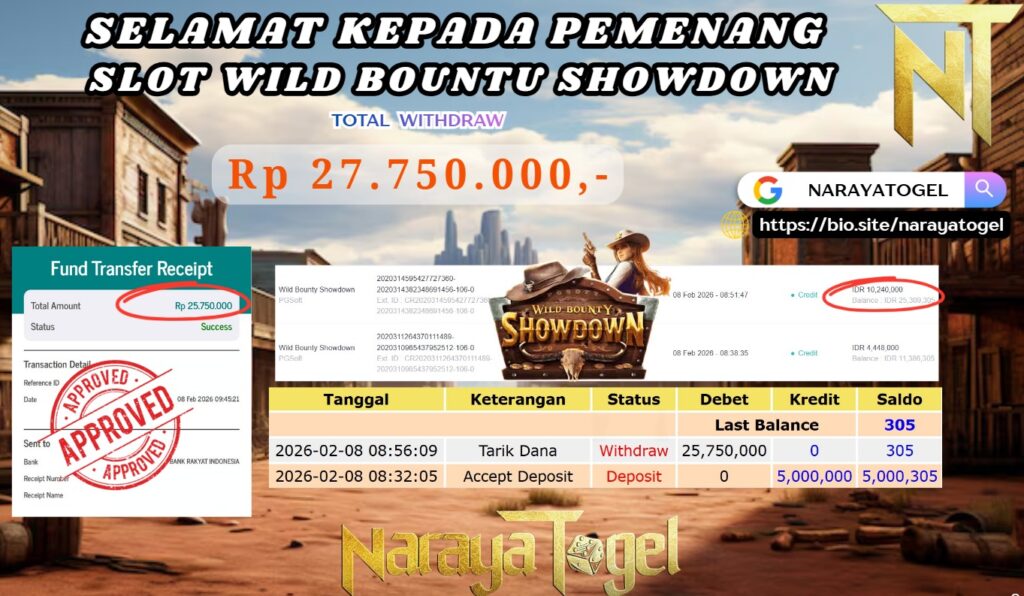 Selamat kepada User id REES** Telah berhasil mendapatkan kemenangan besar pada permainan SLOT WILD BOUNTY SHOWDOWN Dengan kemenangan Sebesar Rp 27.750.000,-Setelah mengisi formulir withdraw dengan kurang waktu hanya 1 – 10 menit pihak NARAYATOGEL sudah melakukan transfer kepada pemiliknya dan dana sudah masuk ke rekening id tersebut oleh pemenang. Bukti pembayaran yang kami berikan merupakan bukti pembayaran yang SAH / VALID yang langsung di dapatkan melalui tanda transfer transaksi berhasil dari Bank yang di tuju.