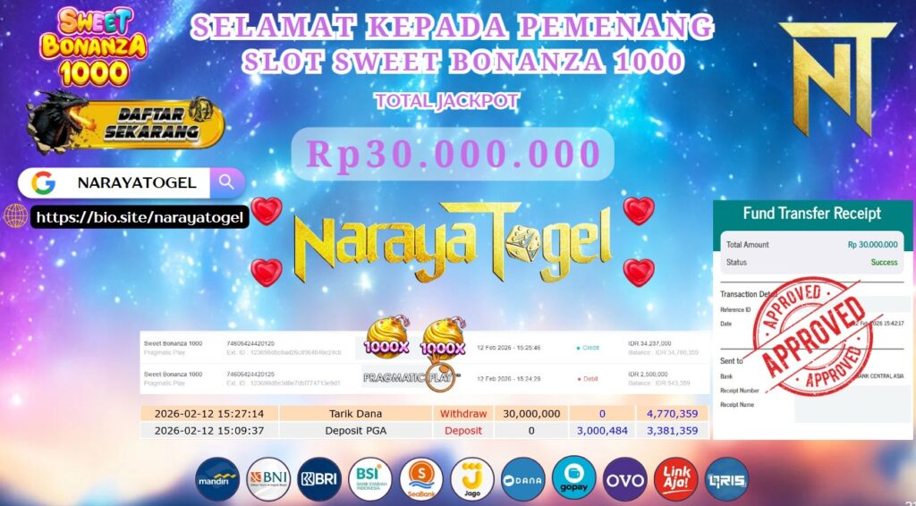 Selamat kepada User id REY* Telah berhasil mendapatkan kemenangan besar pada permainan SWEET BONANZA 1000 Dengan kemenangan Sebesar Rp 30.000.000 Setelah mengisi formulir withdraw dengan kurang waktu hanya 1 – 10 menit pihak NARAYATOGEL sudah melakukan transfer kepada pemiliknya dan dana sudah masuk ke rekening id tersebut oleh pemenang. Bukti pembayaran yang kami berikan merupakan bukti pembayaran yang SAH / VALID yang langsung di dapatkan melalui tanda transfer transaksi berhasil dari Bank yang di tuju.
