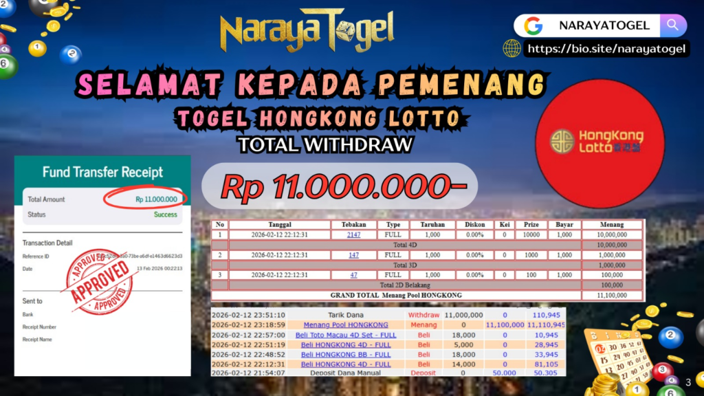 Selamat kepada User id GIO** Telah berhasil mendapatkan kemenangan besar pada permainan TOGEL HONGKONG LOTTO  Dengan kemenangan Sebesar  Rp 11.000.000 Setelah mengisi formulir withdraw dengan kurang waktu hanya 1 – 10 menit pihak NARAYATOGEL sudah melakukan transfer kepada pemiliknya dan dana sudah masuk ke rekening id tersebut oleh pemenang. Bukti pembayaran yang kami berikan merupakan bukti pembayaran yang SAH / VALID yang langsung di dapatkan melalui tanda transfer transaksi berhasil dari Bank yang di tuju.