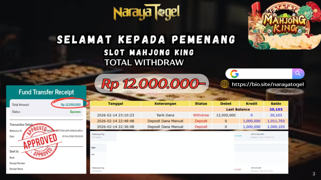 Selamat kepada User id IOP** Telah berhasil mendapatkan kemenangan besar pada permainan SLOT MAHJONG KING   Dengan kemenangan Sebesar  Rp 12.000.000 Setelah mengisi formulir withdraw dengan kurang waktu hanya 1 – 10 menit pihak NARAYATOGEL sudah melakukan transfer kepada pemiliknya dan dana sudah masuk ke rekening id tersebut oleh pemenang. Bukti pembayaran yang kami berikan merupakan bukti pembayaran yang SAH / VALID yang langsung di dapatkan melalui tanda transfer transaksi berhasil dari Bank yang di tuju.