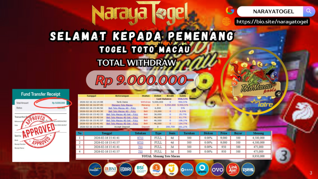 Masih ragu dengan NARAYA TOGEL bos ? Di mana bandar togel online sekarang yang terpercaya seperti NARAYATOGEL ? Bandar yang mengirimkan kemenangan member tanpa bertele – tele. Jadi…. tidak perlu khawatir pada situs NARAYA TOGEL karena kemenangan anda berapapun akan dibayarakan hingga lunas kepada pemenang.
