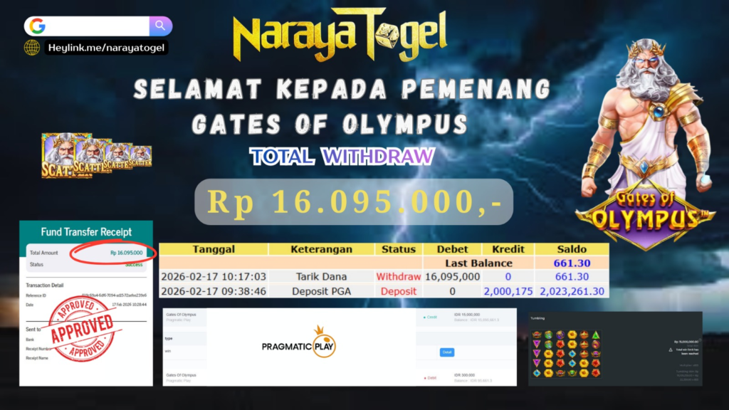 Selamat kepada User id FER** Telah berhasil mendapatkan kemenangan besar pada permainan GATES OF OLYMPUS   Dengan kemenangan Sebesar  Rp 16.095.000 Setelah mengisi formulir withdraw dengan kurang waktu hanya 1 – 10 menit pihak NARAYATOGEL sudah melakukan transfer kepada pemiliknya dan dana sudah masuk ke rekening id tersebut oleh pemenang. Bukti pembayaran yang kami berikan merupakan bukti pembayaran yang SAH / VALID yang langsung di dapatkan melalui tanda transfer transaksi berhasil dari Bank yang di tuju.