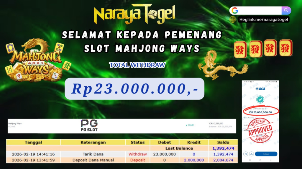 Selamat kepada User id POI** Telah berhasil mendapatkan kemenangan besar pada permainan SLOT MAHJONG WAYS  Dengan kemenangan Sebesar  Rp 23.000.000 Setelah mengisi formulir withdraw dengan kurang waktu hanya 1 – 10 menit pihak NARAYATOGEL sudah melakukan transfer kepada pemiliknya dan dana sudah masuk ke rekening id tersebut oleh pemenang. Bukti pembayaran yang kami berikan merupakan bukti pembayaran yang SAH / VALID yang langsung di dapatkan melalui tanda transfer transaksi berhasil dari Bank yang di tuju.