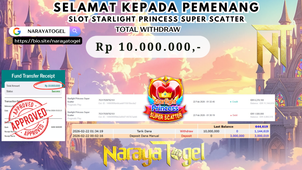 Selamat kepada User id BEKAM* Telah berhasil mendapatkan kemenangan besar pada permainan SLOT STARLIGHT PRINCESS SUPER SCATTER Dengan kemenangan Sebesar Rp 10.000.000 Setelah mengisi formulir withdraw dengan kurang waktu hanya 1 – 10 menit pihak NARAYATOGEL sudah melakukan transfer kepada pemiliknya dan dana sudah masuk ke rekening id tersebut oleh pemenang. Bukti pembayaran yang kami berikan merupakan bukti pembayaran yang SAH / VALID yang langsung di dapatkan melalui tanda transfer transaksi berhasil dari Bank yang di tuju.