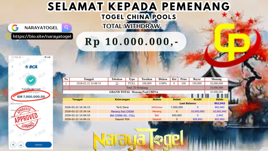 Selamat kepada User id gop** Telah berhasil mendapatkan kemenangan besar pada permainan TOGEL CHINA POOLS Dengan kemenangan Sebesar Rp 10.000.000 Setelah mengisi formulir withdraw dengan kurang waktu hanya 1 – 10 menit pihak NARAYATOGEL sudah melakukan transfer kepada pemiliknya dan dana sudah masuk ke rekening id tersebut oleh pemenang. Bukti pembayaran yang kami berikan merupakan bukti pembayaran yang SAH / VALID yang langsung di dapatkan melalui tanda transfer transaksi berhasil dari Bank yang di tuju.